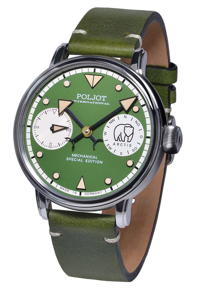 But not only the polar bear, which adorns the right-hand circle of the dial as the main motif, but also the color contrasts of the individual models, play a major role in this hand-wound watch. Four different color variations reflect the theme around the North Pole. Sometimes a little quieter and more classic, sometimes striking and contrasting, like two opposite poles.