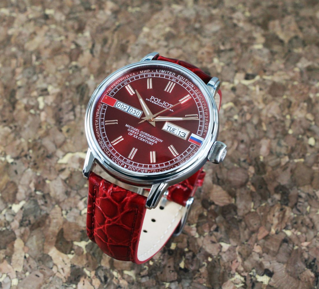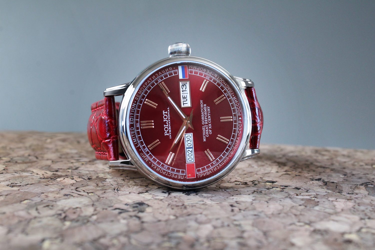 Zifferblatt: Leicht am Rand gebogen, rot mit vergoldeten Stundenapplikationen