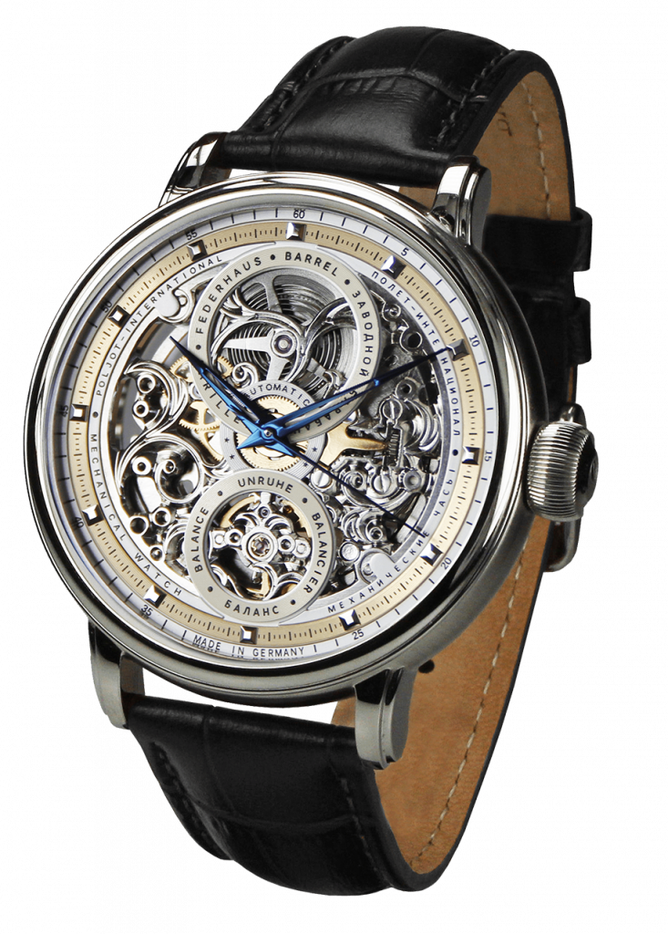 Eben diese Kunstwerke bildeten die Inspiration bei der Gestaltung des Designs dieser Automatikuhr: Klassisch & kรผnstlerisch skelettiert zeichnet sich der Skeleton durch eine Mischung von traditionellen Arabesken, sowie runden und geschwungen Formen aus. Die sich im Mittelpunkt der Uhr befindlichen Ringe, offenbaren einen Blick auf die Unruh und das Federhaus, die durch skelettierte Rotoren vervollstรคndigt werden.