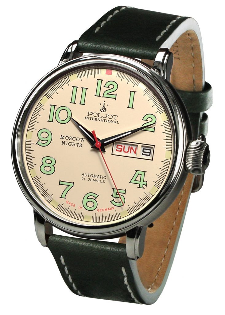 Werk: Automatik Kal. 2427 Slava mit Datum & Wochentag, Doppelfederhaus, 21 Rubine, 18 000 A/h, stoรgesichert, Gangreserve 42 Stunden