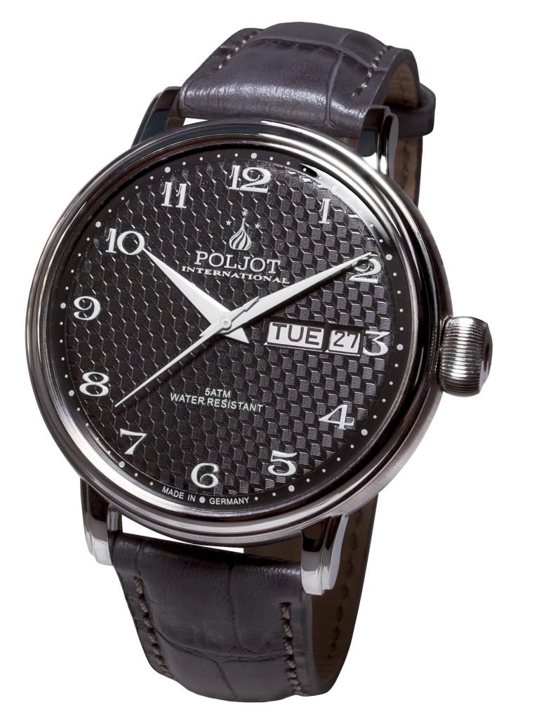 Werk: Automatik Kal. 2427 Slava mit Datum & Wochentag, Doppelfederhaus, 18 000 A/h, 21 Rubine, Stoรsicherung, 42 h Gangreserve