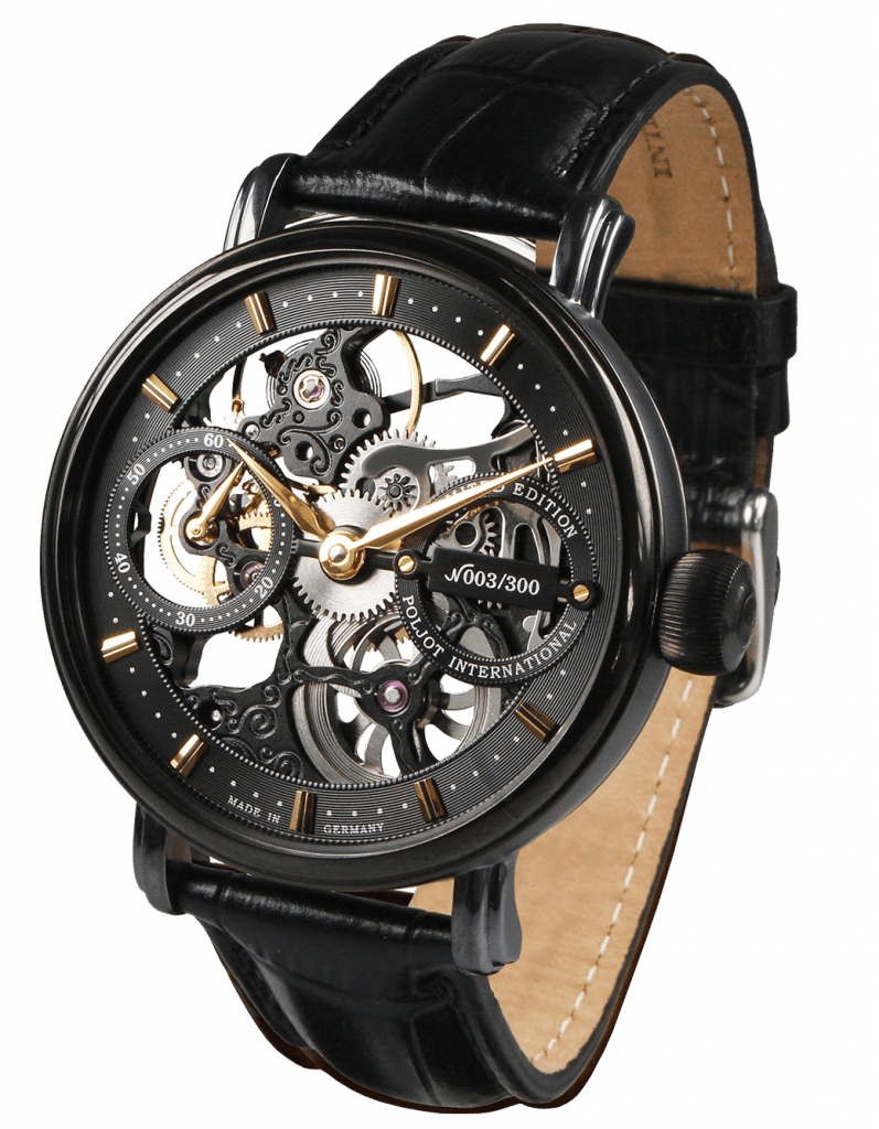 Werk: Handaufzug Kal. 9011 PI, skelettiert, 18 Steine, 18000 A/h, Gangreserve 38 h