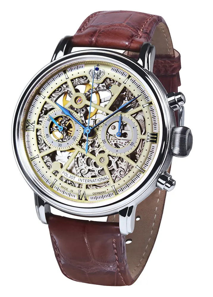 Werk: Handaufzugs-Chronograph Kal. 2901-SeaGul, Skeleton, 22 Steine, 21600 A/h, stoรgesichert, Gangreserve 45 Stunden (37 Stunden bei Stoppfunktion an)
