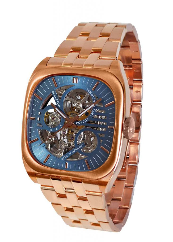 Case: Stainless steel case, rose gold-plated, 38,5 mm x 38,5 mm, height = 11,4 mm, 3 atm, glass back