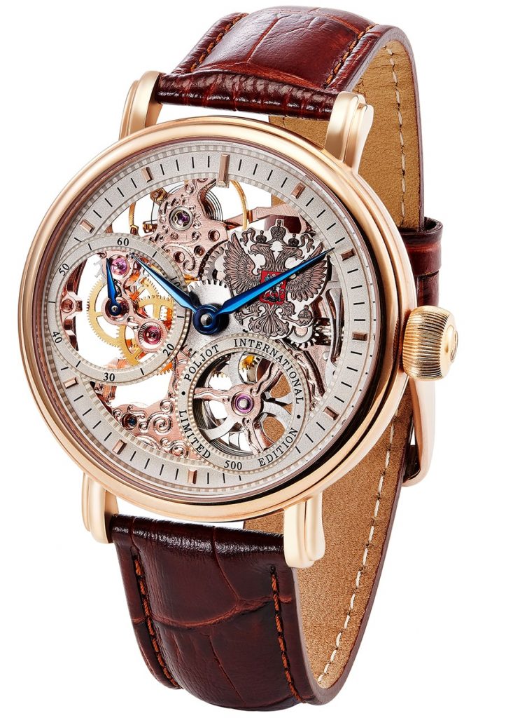 Werk:ย Handaufzug Kal. 9011 PI, skelettiert, 18 Steine, 18000 A/h, Gangreserve 38 h