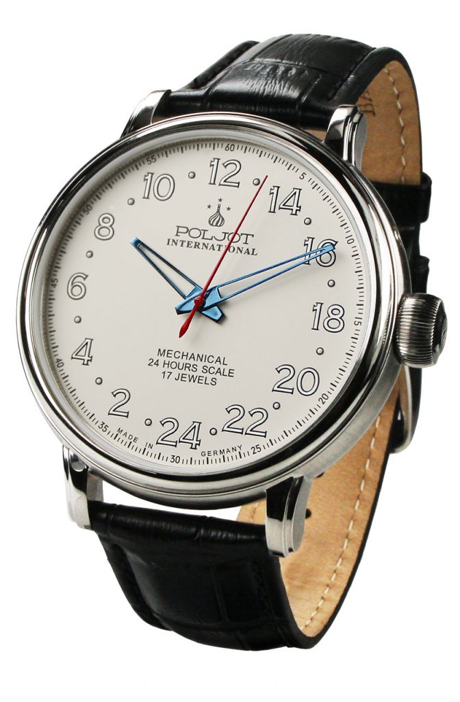 Werk: Handaufzug Kal. 2423 Vostok mit 24-Stunden-Anzeige, 17 Rubine, 19 800 A/h, Gangreserve 38 Stunden