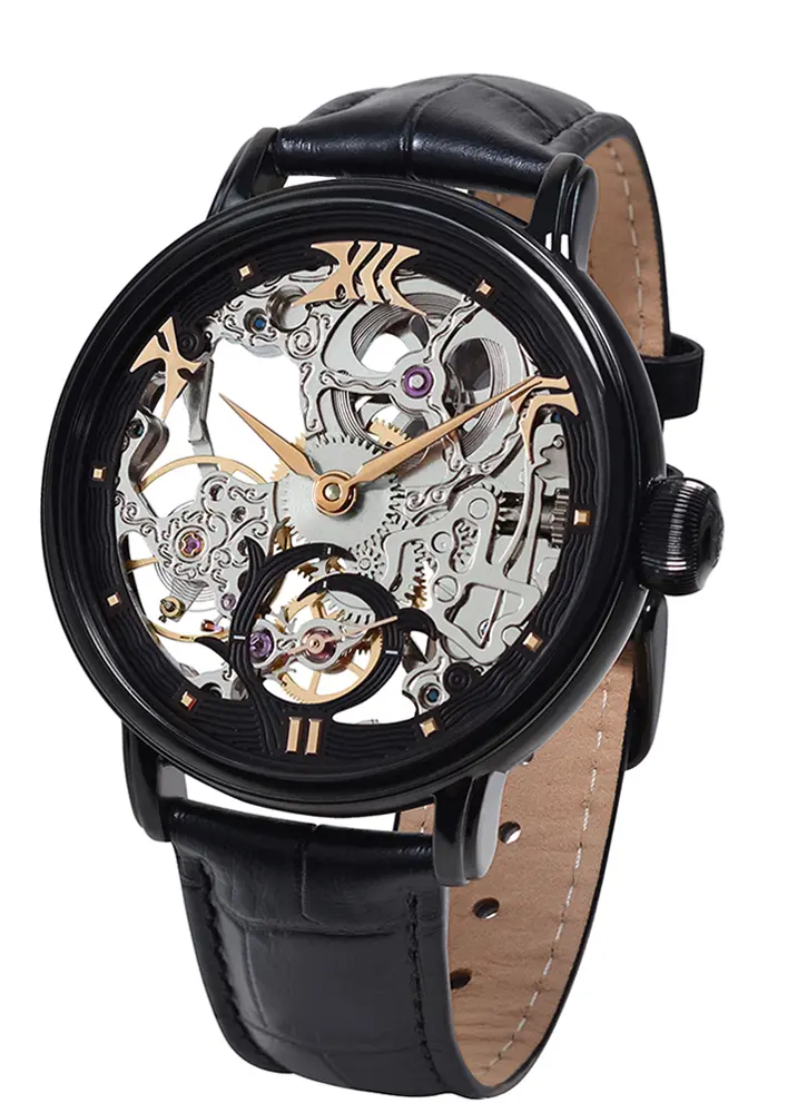 Werk:ย Handaufzug Kal.9910, 17 Steine, 21 600 A/h, skelettiert und graviert, Gangreserve 36 h