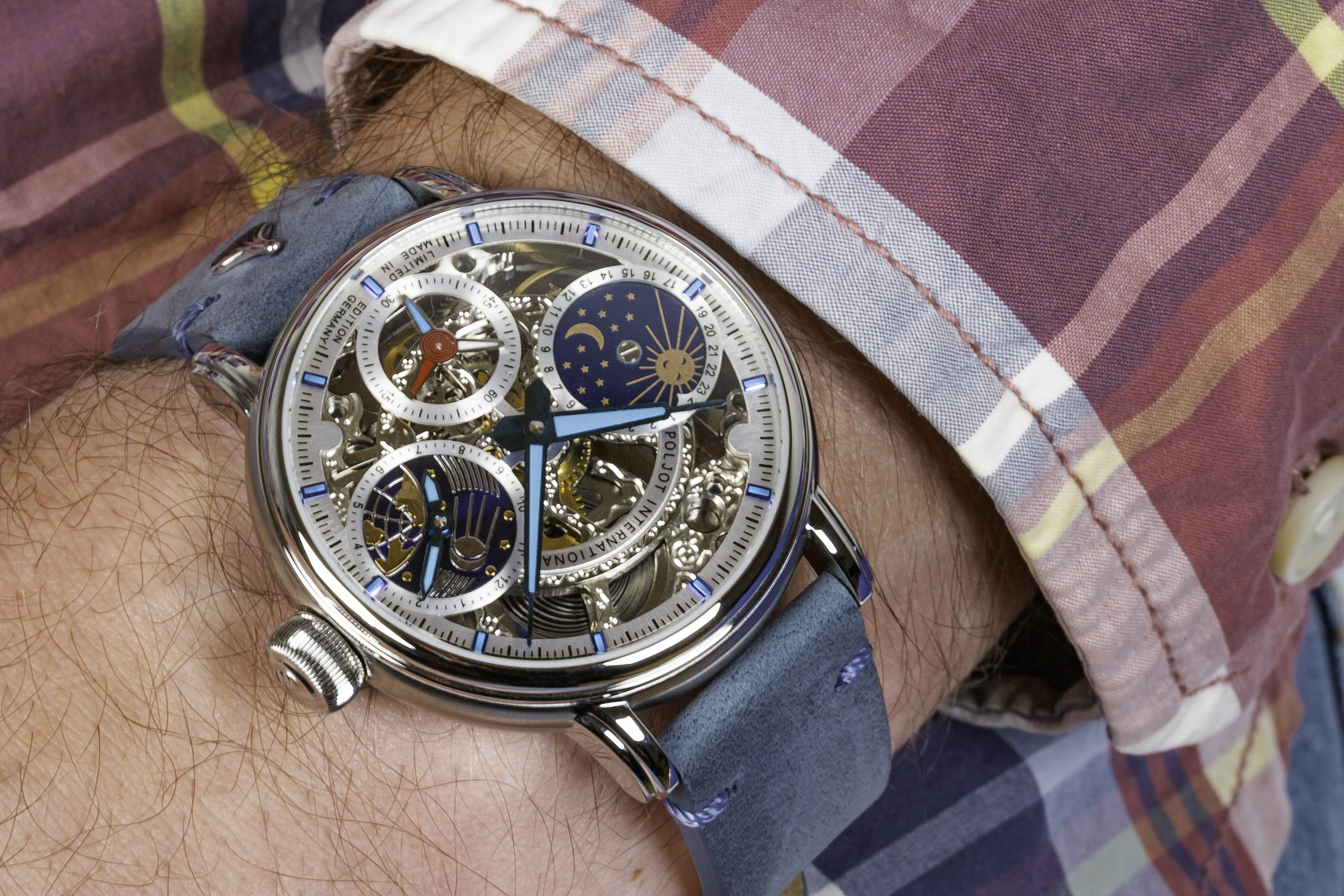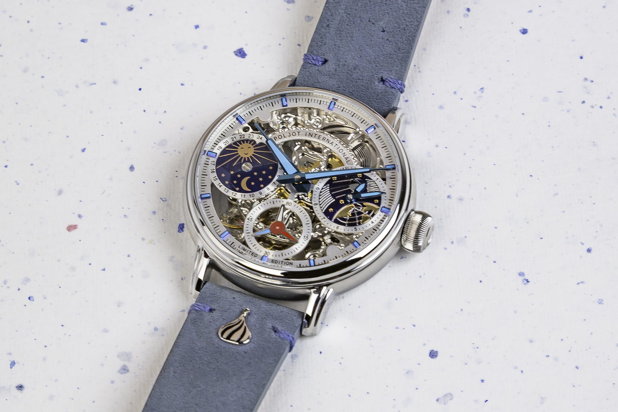 Das Zifferblatt des „Sputnik“-Designs zeigt bei 3 Uhr eine zweite Zeitzone. Im unteren Bereich ist die Erdkugel dargestellt, darüber der runde Satellit „Sputnik“, der den Planeten Erde umkreist – samt seiner Umlaufbahn. Auf der 6-Uhr-Position befindet sich die kleine Sekunde, die sich als Orbit elegant in das Weltraum-Design einfügt. Ein roter Zeiger ermöglicht das präzise Ablesen der Sekunden. Die Stundenmarkierungen sind im Außenbereich des Zifferblatts in rechteckiger Form angeordnet und mit blauer Leuchtfarbe beschichtet, was eine gute Lesbarkeit auch bei Dunkelheit gewährleistet. Auch die blauen Zeiger sind für einen Leuchteffekt im Dunkeln mit Leuchtmasse versehen. Auf der 9-Uhr-Position befindet sich eine Tag-/Nachtanzeige, die durch ein Sonne-Mond-Sternen-Design veranschaulicht wird. Das Ergebnis ist ein stimmiges, von der Raumfahrt inspiriertes Design, das die Ästhetik des Weltraums eindrucksvoll einfängt.