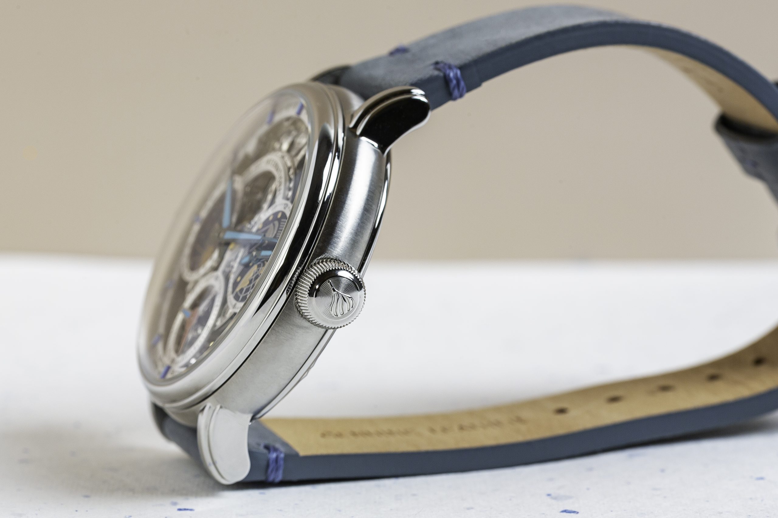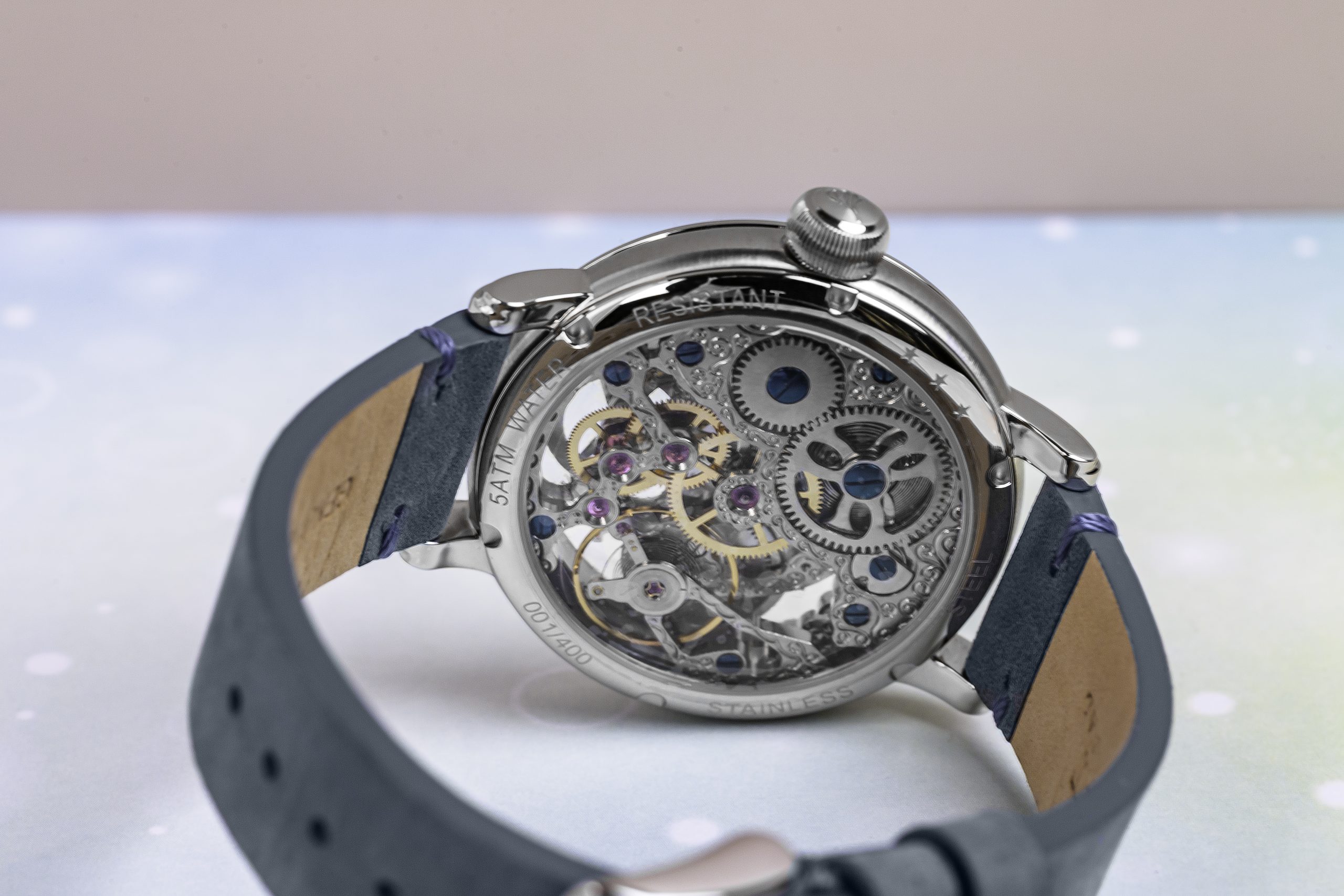Durch den Glasboden ist das skelettierte und gravierte Handaufzugskaliber 9931-PI sichtbar. Dieses verfügt über eine Gangreserve von 36 Stunden. Abgedeckt ist das runde 43-Millimeter-Edelstahlgehäuse mit einem Saphirglas.