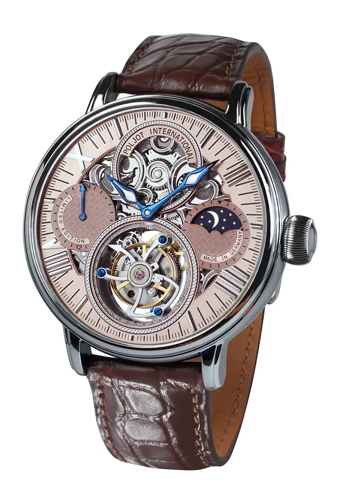 Werk:ย Handaufzug Kaliber 3360, skelettiert und graviert, Tag & Nacht- Anzeige, Zeitangabe โGreenwich Timeโ,ย 19 Steine, 28 000 A/h, 40 Stunden Gangreserve