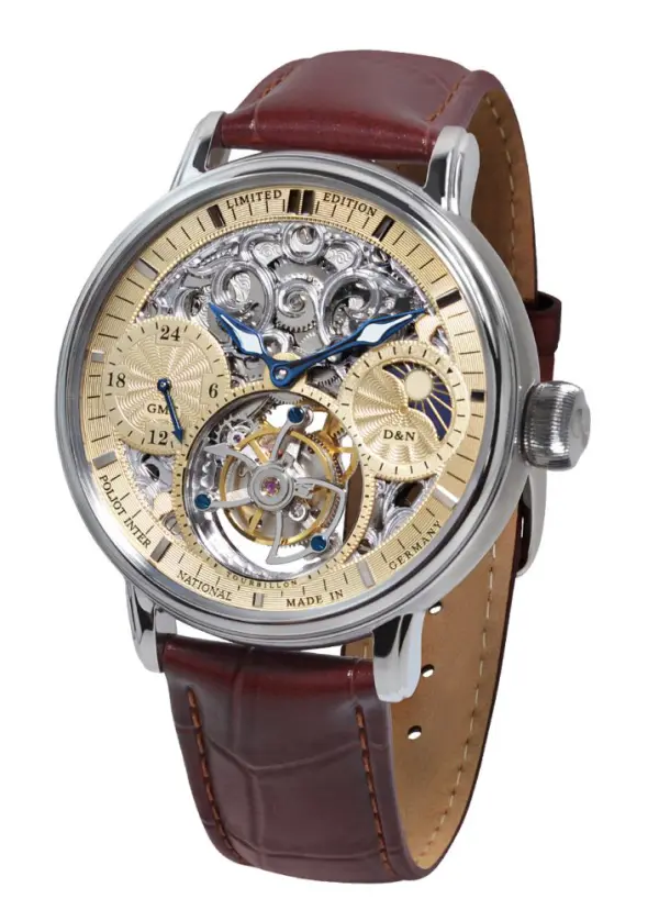 Werk: Handaufzug Kal.3360, veredelt, skelettiert, Zeitangabe „Greenwich Time“, Tag&Nacht-Anzeige, 28000 A/h, 19 Steine, stoßgesichert, 40 h Gangreserve